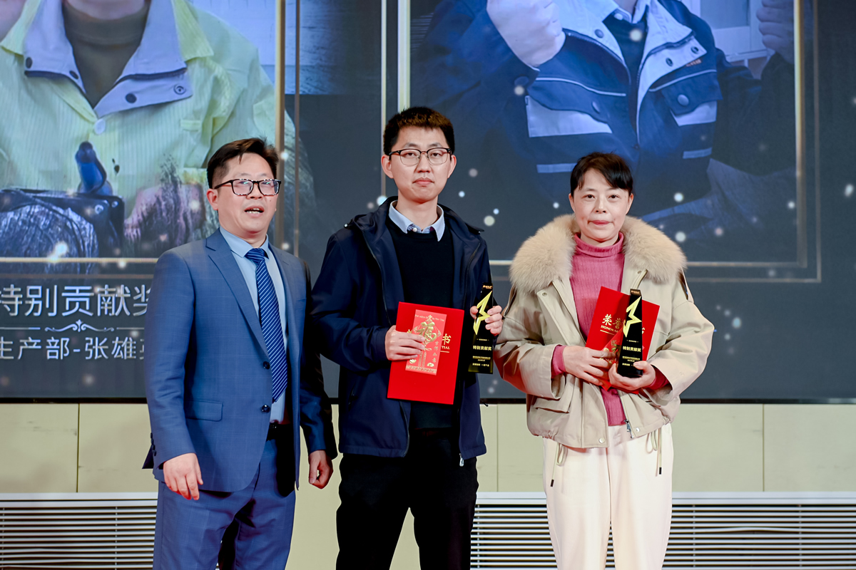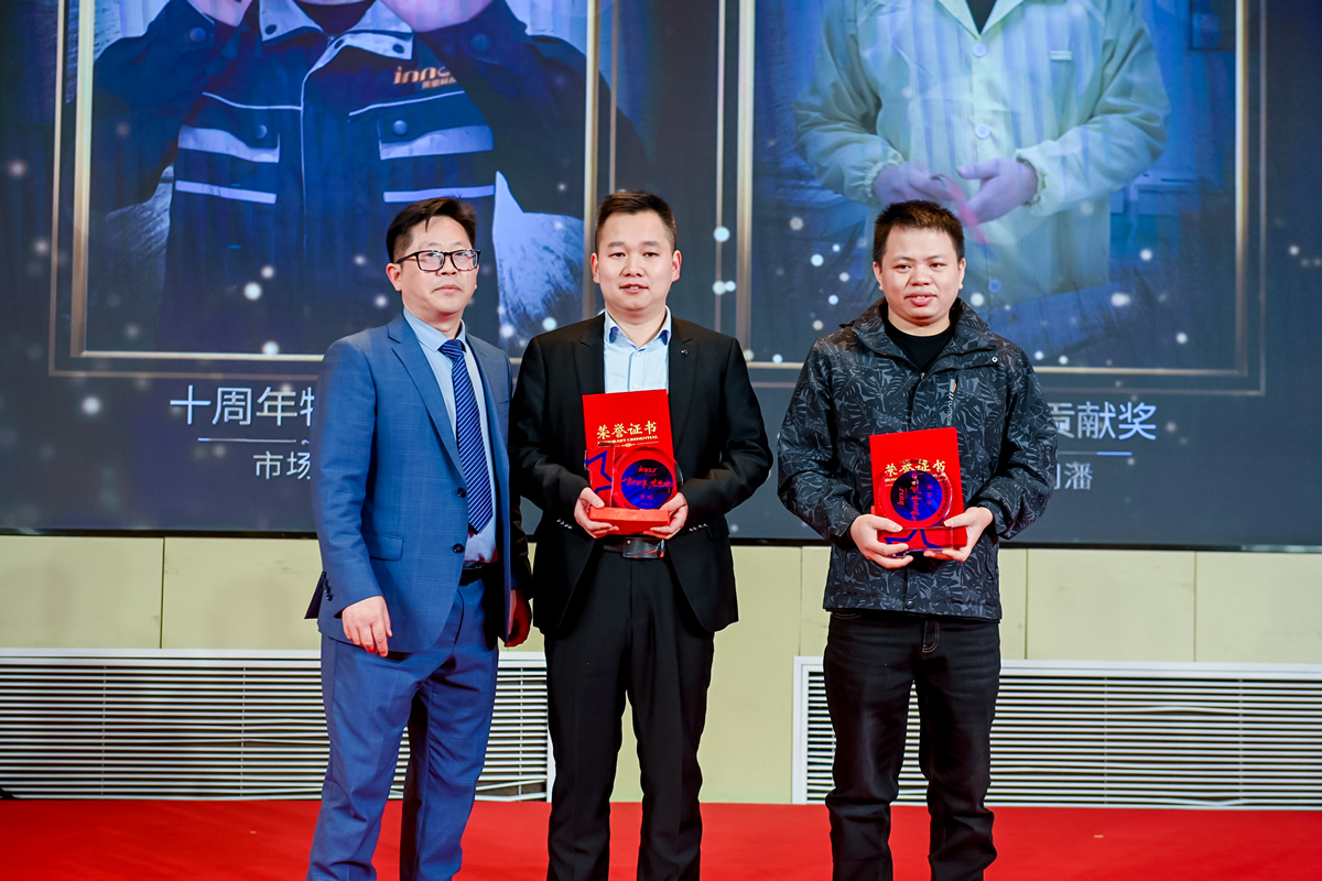 頒獎詞:他們是英諾科技發(fā)展的見證者和創(chuàng)造者,十年來,他們和公司同呼吸、共命運,雖經(jīng)歷風(fēng)雨,卻始終不離不棄!獲得英諾科技2023年度十周年特別貢獻獎的是:市場一部陳球,干變生產(chǎn)部廖明潘!